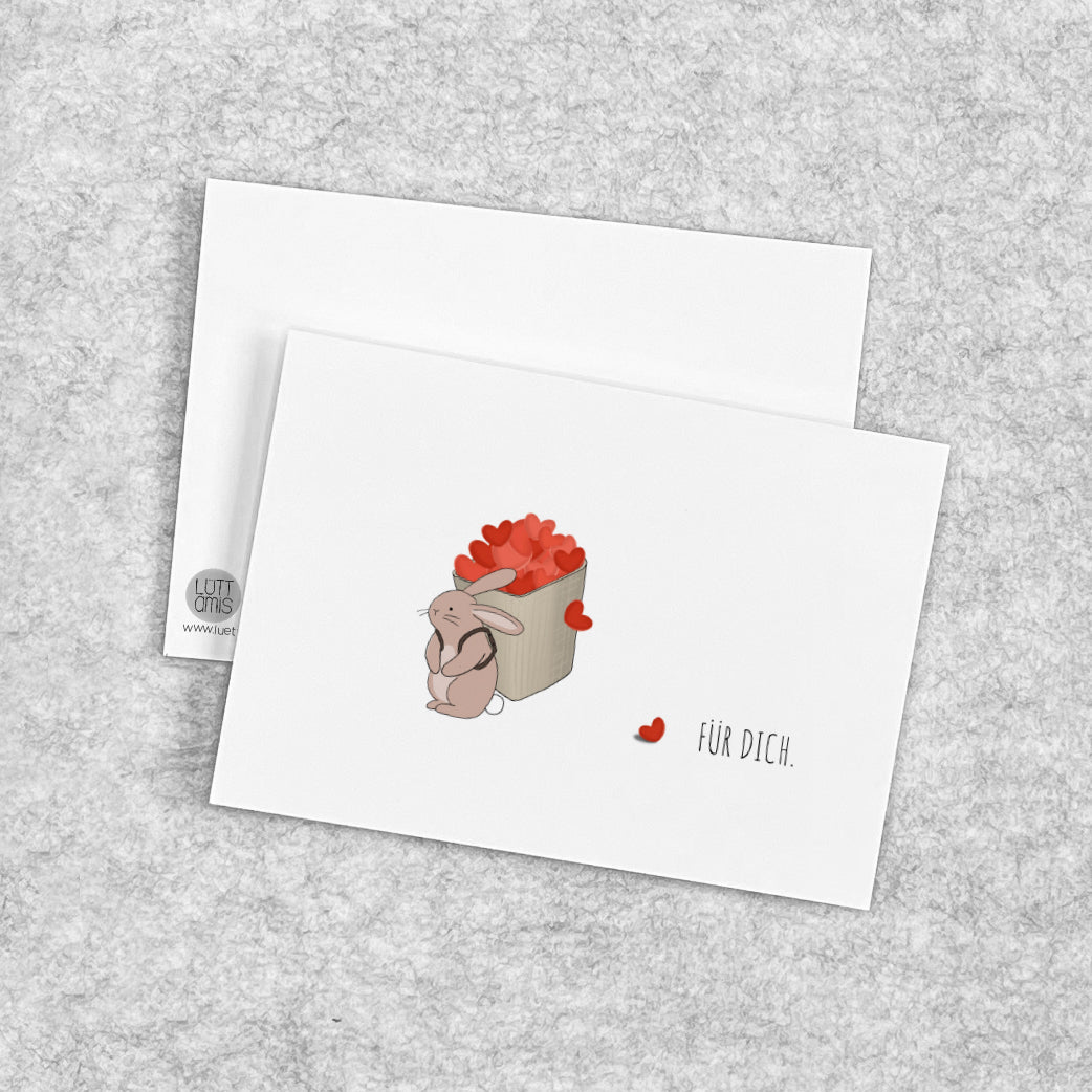 Dieses süße Häschen hat einen ganz besonderen Schatz auf dem Rücken – einen großen Korb voller Herzen! Ob als liebevolle Überraschung, zum Valentinstag oder einfach, um jemandem eine Freude zu machen – mit dieser Karte schenkst du garantiert ein Lächeln.